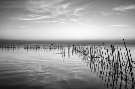 Detail of nets and traditional fishing equipment used in the Albufera Natural Park, Valencia, Spain. Black and white image