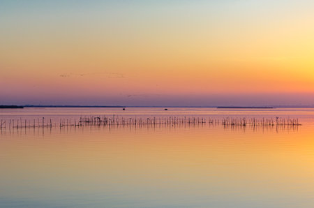 Sunset panoramic view waters of Albufera lagoon, Valencia, Spain