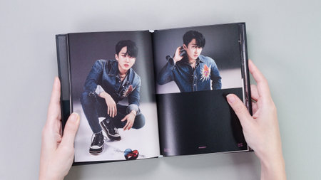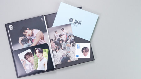 Fan holding Stray Kids MAXIDENT mini Album photobook on grey. Music CD. South Korean boy band StrayKids. Space for text. Gatineau, QC Canada - December 07 2022.