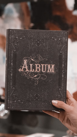 Photo album book on old wooden table