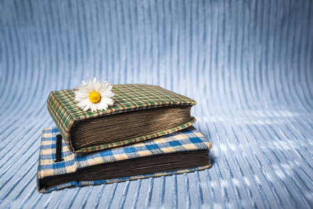 Old nostalgic photo album with small daisy flower on blue rippled background (copy space)