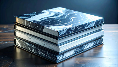 Pile of composition notebooks with black-and-white marbled covers, neatly stacked on a wooden surface, traditional school supplies layout