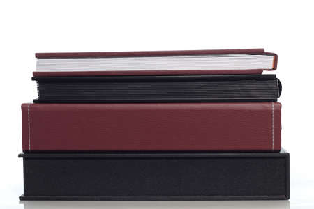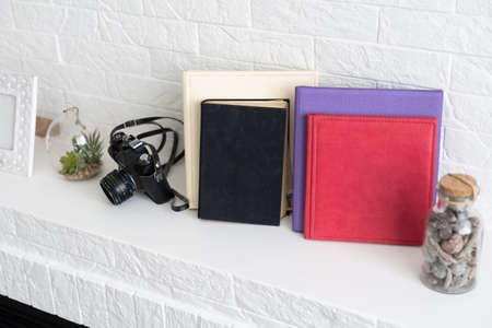 Composition of photo books in natural white leather of different sizes. The white paper on a dark background