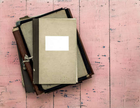 stack of retro folders on old pink wooden background