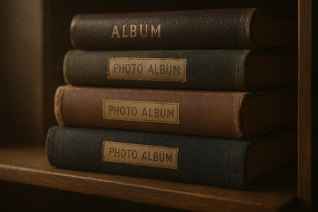 A close-up shot of several aged and worn photo albums stacked on a dark, rustic wooden shelf, with subtle dust particles catching the light, creating a nostalgic and historical atmosphere. Perfect for themes of memories, heritage, and the passage of time.