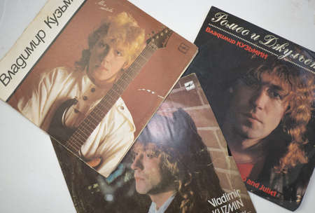 Volgograd, Russia - October 26, 2021: Old vinyl record or disc of the famous Soviet and Russian performer Vladimir Kuzmin.