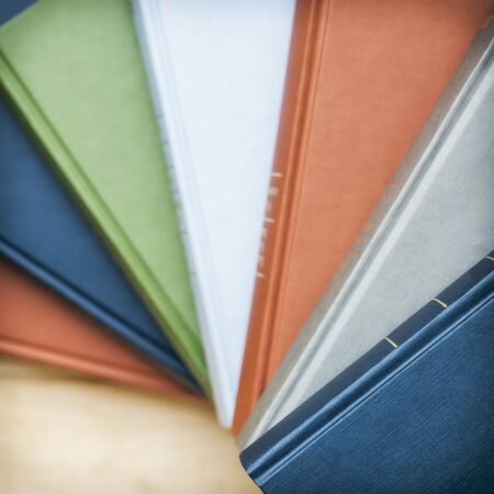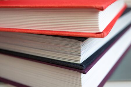 Close-up of book stack. Several colorful books with selective focus. Education concept