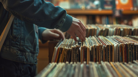 Exploring vintage vinyl collection in retro music store setting.
