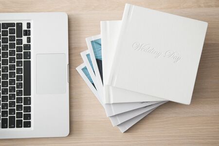 Different photobooks and photoboxes on white wooden table. Textile and leather
