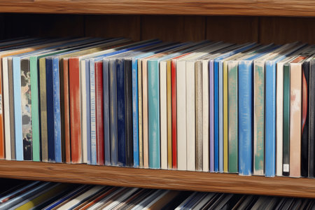 Diverse Collection of Colorful Vinyl Records on Wooden Shelf.