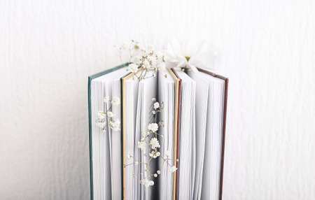 Books with fresh flowers on white background