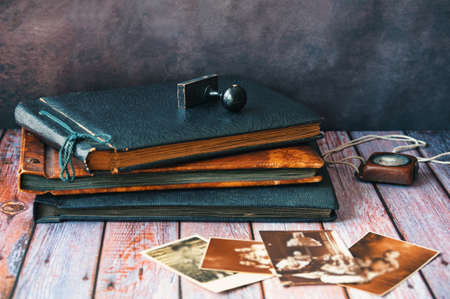Retro albums with vintage monochrome photographs from the beginning of 20th century