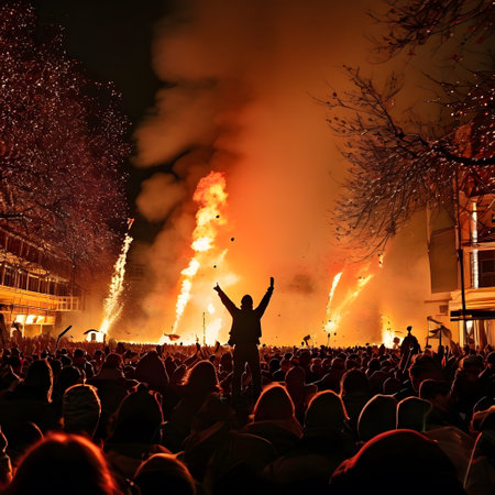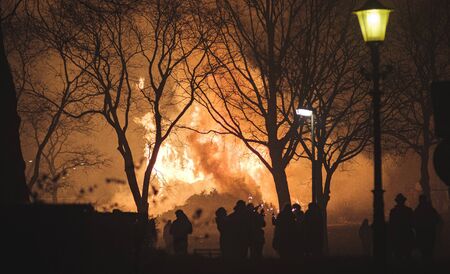 Group of people raising hands cheering and celebrating in front of huge bonfire flames at night, fire, warm colors, dark silhouettes, smoke, orange