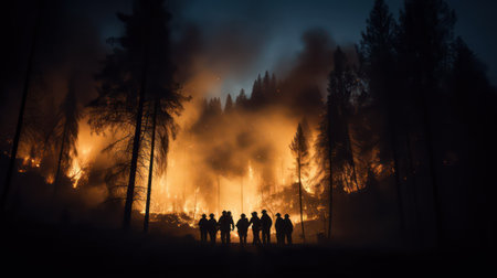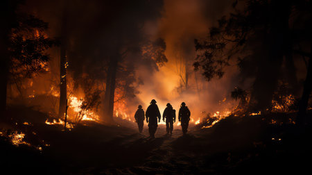 A group of brave fighting firefighters a raging inferno, their silhouettes illuminated by the flames as they work tirelessly to contain the blaze and save lives.