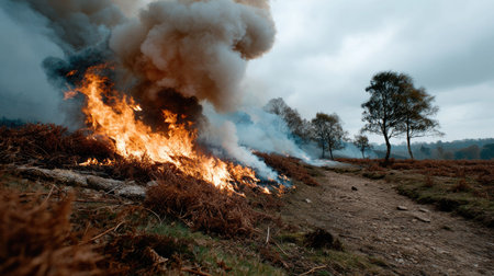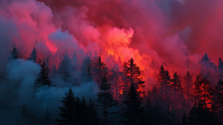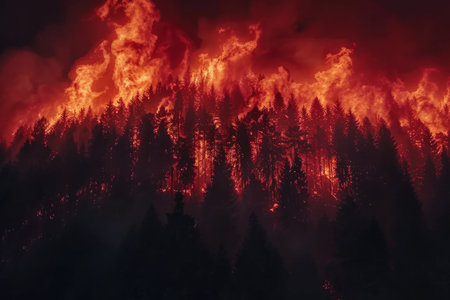 A fierce wildfire engulfs the landscape with vibrant flames and heavy smoke, showcasing the impact on the environment and natural beauty.