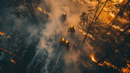 From above, firefighters are seen combating forest flames, a testament to human courage and resilience in the face of wildfires.