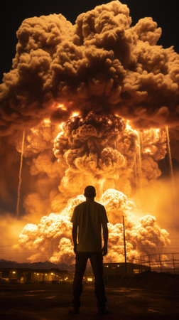 Nuclear war concept. Explosion of nuclear bombs. Creative artwork decoration in dark. People looking at giant mushroom cloud of atomic explosion. selective focus