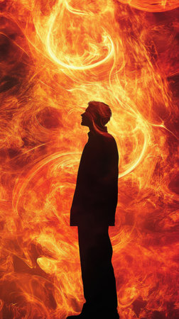 A dramatic portrait of a man with an overlay of fire and smoke effects, creating a powerful and intense visual impact.