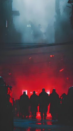 This image features silhouetted figures observing a cloud of smoke or vapor against an atmospheric backdrop. The composition showcases a dark and moody scene with a gradient of colors from deep blues to warm oranges. The lighting is diffused, suggesting an outdoor environment. This visual is suitable for conceptual or editorial applications.