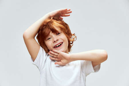 Cheerful boy holding his hands above his head smile emotions cropped view white t-shirt