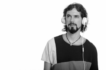Portrait of young man on black background with hard light. He has a serious expression on the face like thinking or meditating. He has short hair but natural and a little beard and brown eyes.
