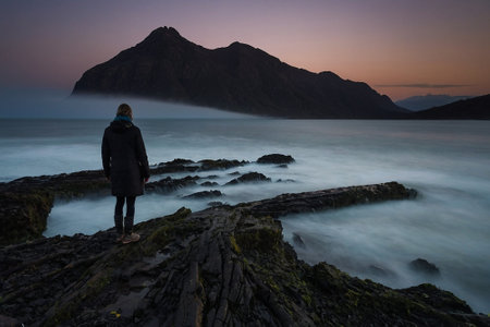 Woman watching the sunrise on the beach at Lofoten islands, Norway