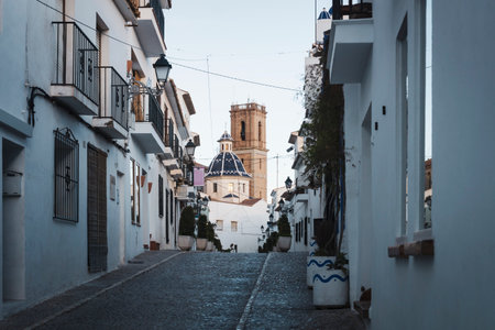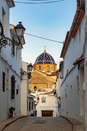 Old town of Altea with cobblestoned street and view on blue domed cathedral and clock tower, Altea, Costa Blanca, Spain