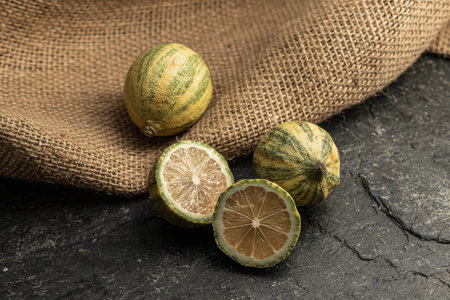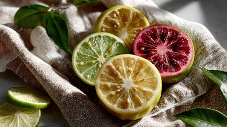 A visually appealing arrangement of freshly sliced citrus fruits featuring lemon, lime, and a striking red citrus variant on a textured fabric.