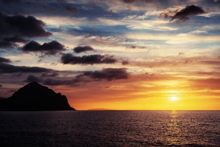 Isola di Taverna in front of Porto Taverna at sunset. Beautiful island of Sardinia.