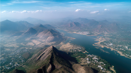 This stunning aerial photograph captures a breathtaking view of mountains and a winding river beneath a clear blue sky, showcasing nature's beauty.