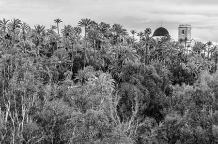 View of the city of Elche, Alicante province, Spain, showing the palm grove and the basilica; black and white image