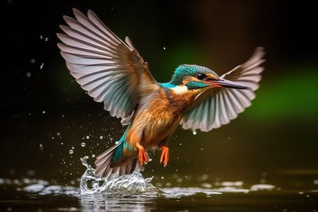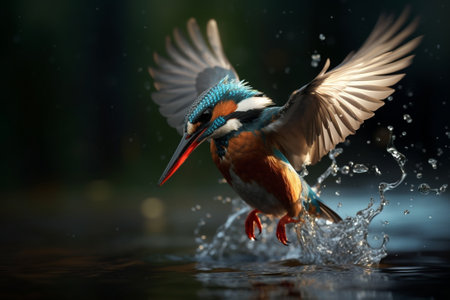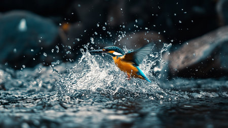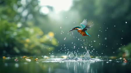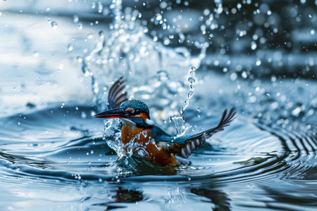 Kingfisher taking flight with splashing water in background nature and wildlife travel adventure beauty art trip