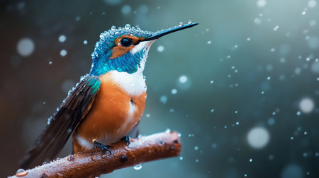 A small, colorful hummingbird sits on a slender, rain-soaked branch