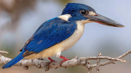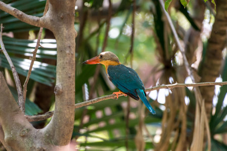 Stork billed king fisher perched on bush branch, relaxed and watchful awareness at the same time. close up bird portraiture.