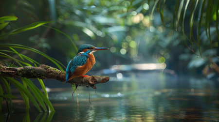 Colorful kingfisher poised on a branch over a clear stream, ready to dive, surrounded by lush greenery