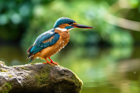 A vibrant kingfisher perched on a rock by a serene riverbank. The colorful bird reflects beautifully in the calm water, surrounded by lush greenery.