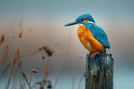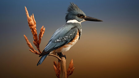 a majestic belted kingfisher bird gracefully perches on a sturdy brown stem, its vibrant plumage contrasting against the vibrant backdrop of the setting sun. ai generated