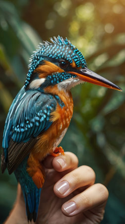 Vibrant kingfisher resting gently on a human hand, nature interaction shown