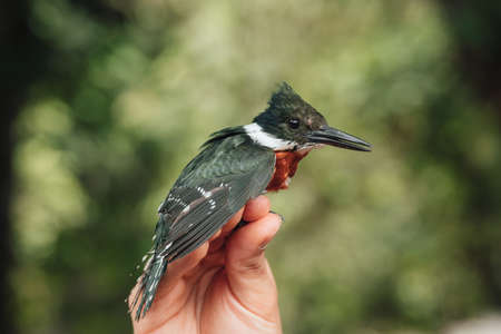 Profile portrait of a tropical kingfisher bird on a human hand with jungle background behind
