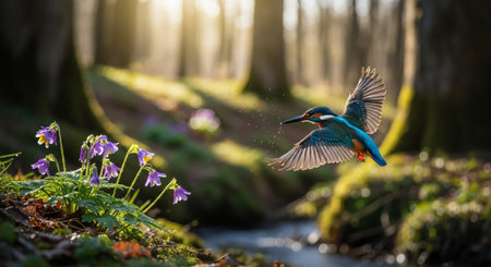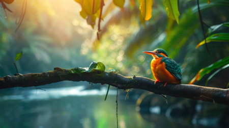 Brightly colored kingfisher bird resting near a stream, its vivid plumage glowing in gentle sunlight.