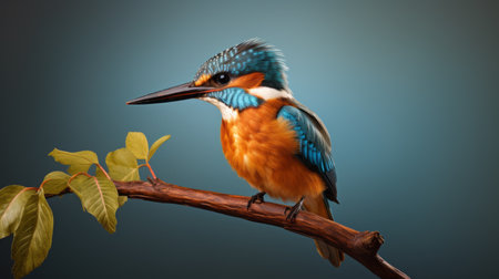 blue bird perched on a branch against a vibrant blue background, reminiscent of sacha goldberger's style. the image showcases a captivating blend of dark orange and light emerald hues, creating a hyperrealistic portrayal of marine life. with a shallow depth of field, ruslan lobanov's digital art techniques bring forth an explosive depiction of wildlife. ai generated