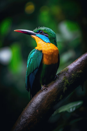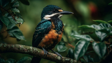 Multi colored bird perching on branch in tranquil tropical forest generated by artificial intelligence