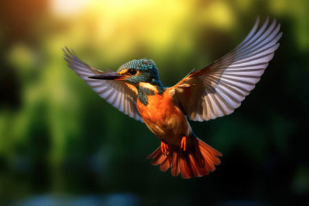 A stunning kingfisher bird captured in mid-flight above a shimmering water surface, surrounded by lush greenery, showcasing the beauty of nature.