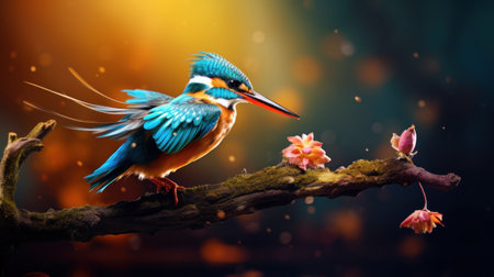 An AI generated illustration of A vibrant bird perched on a branch with a dark background