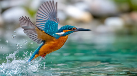 Kingfisher taking off from the water surface with open wings and splashing water drops