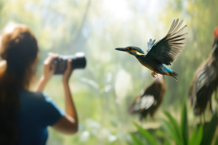 A person photographs a vibrant kingfisher flying amidst lush greenery, showcasing wildlife and photography skills.