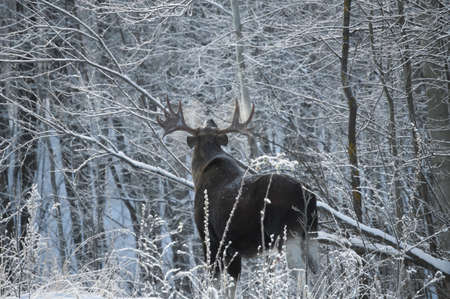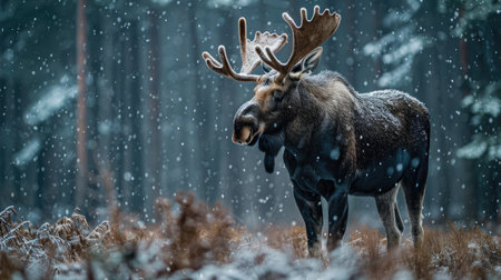 Large bull moose with large antlers is standing in a snowy forest with orange ferns
