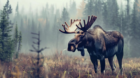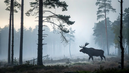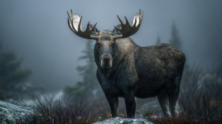 Moose is present in the morning fog of Canada, highlighting its role in nature and symbolizing endurance in a wild environment.