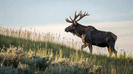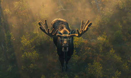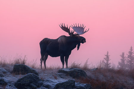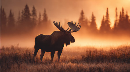 Majestic bull moose at sunrise, foggy mountain landscape, wildlife photography