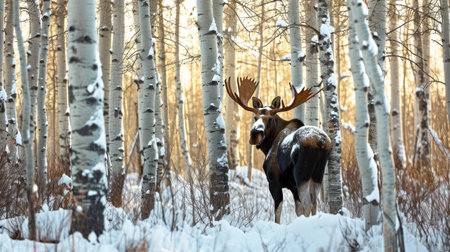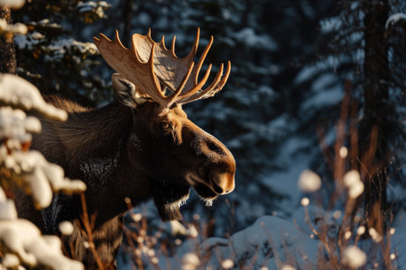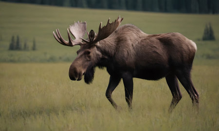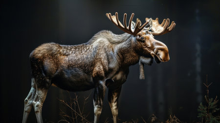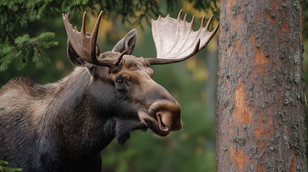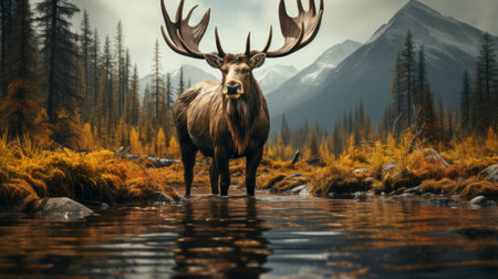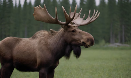 A majestic moose stands proudly in its natural habitat, showcasing impressive antlers. Surrounded by lush greenery and a serene environment, this scene captures the beauty of wildlife.